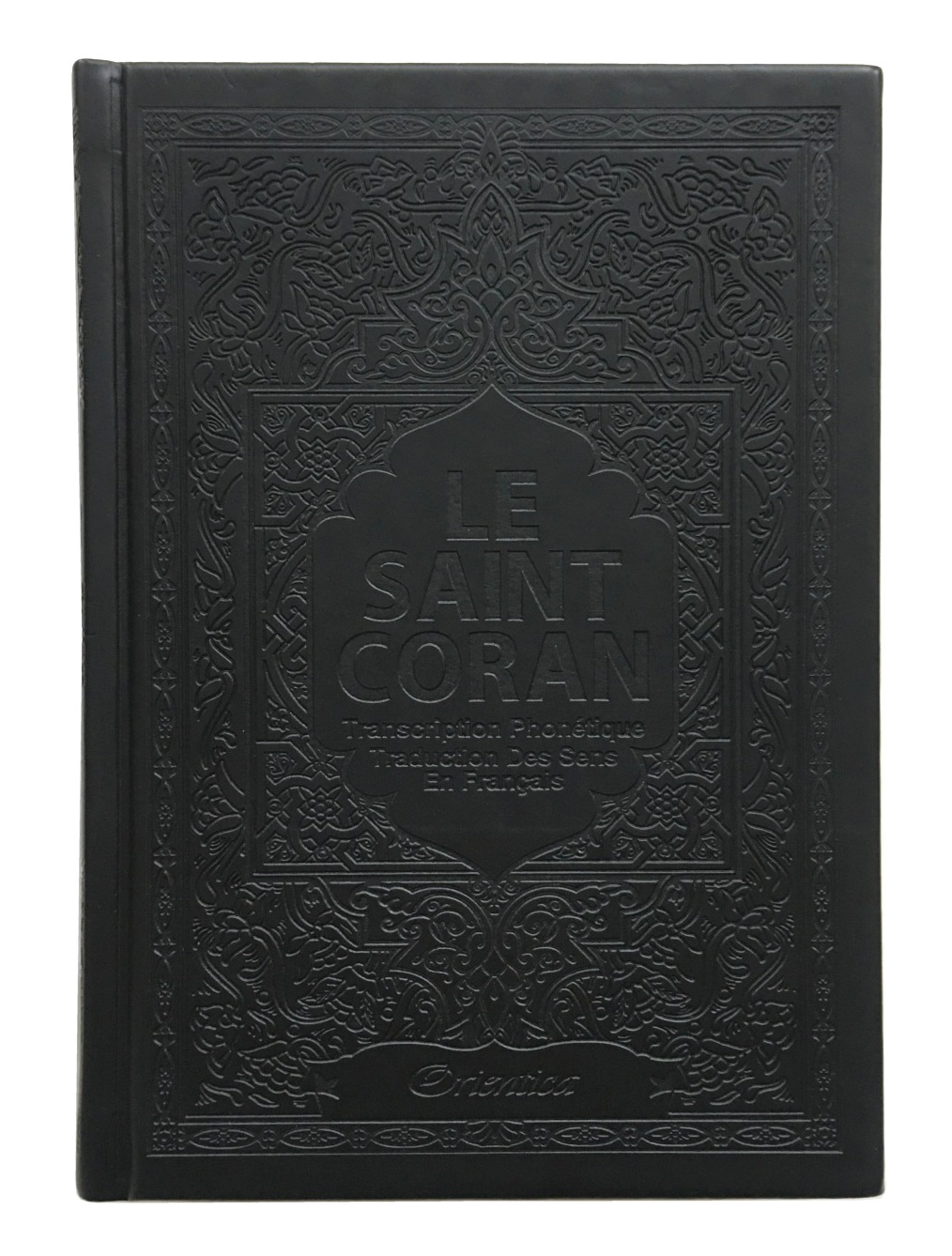 Le saint Coran avec versets en arabe, traduction française + transcription phonétique (translittération de l'arabe en caractères latins). Impression couleur, avec marque page intégré.