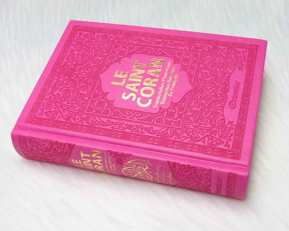 Magnifique Coran avec couverture cartonnée de type cuir, doux au toucher. Très jolie couleur rose avec dorure. Idéal pour offrir.
