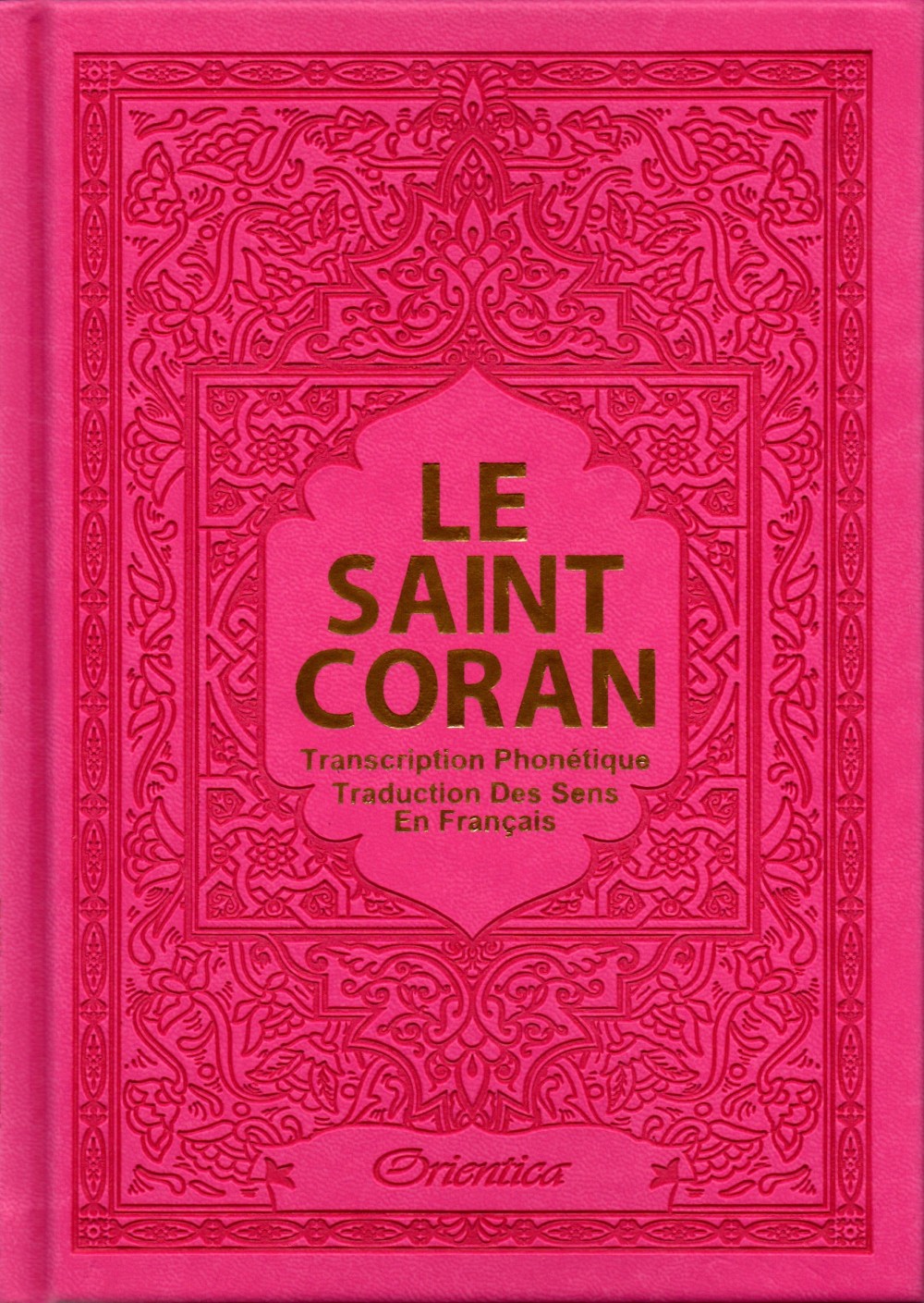Le saint Coran avec versets en arabe, traduction française + transcription phonétique (translittération de l'arabe en caractères latins). Impression couleur, avec marque page intégré.