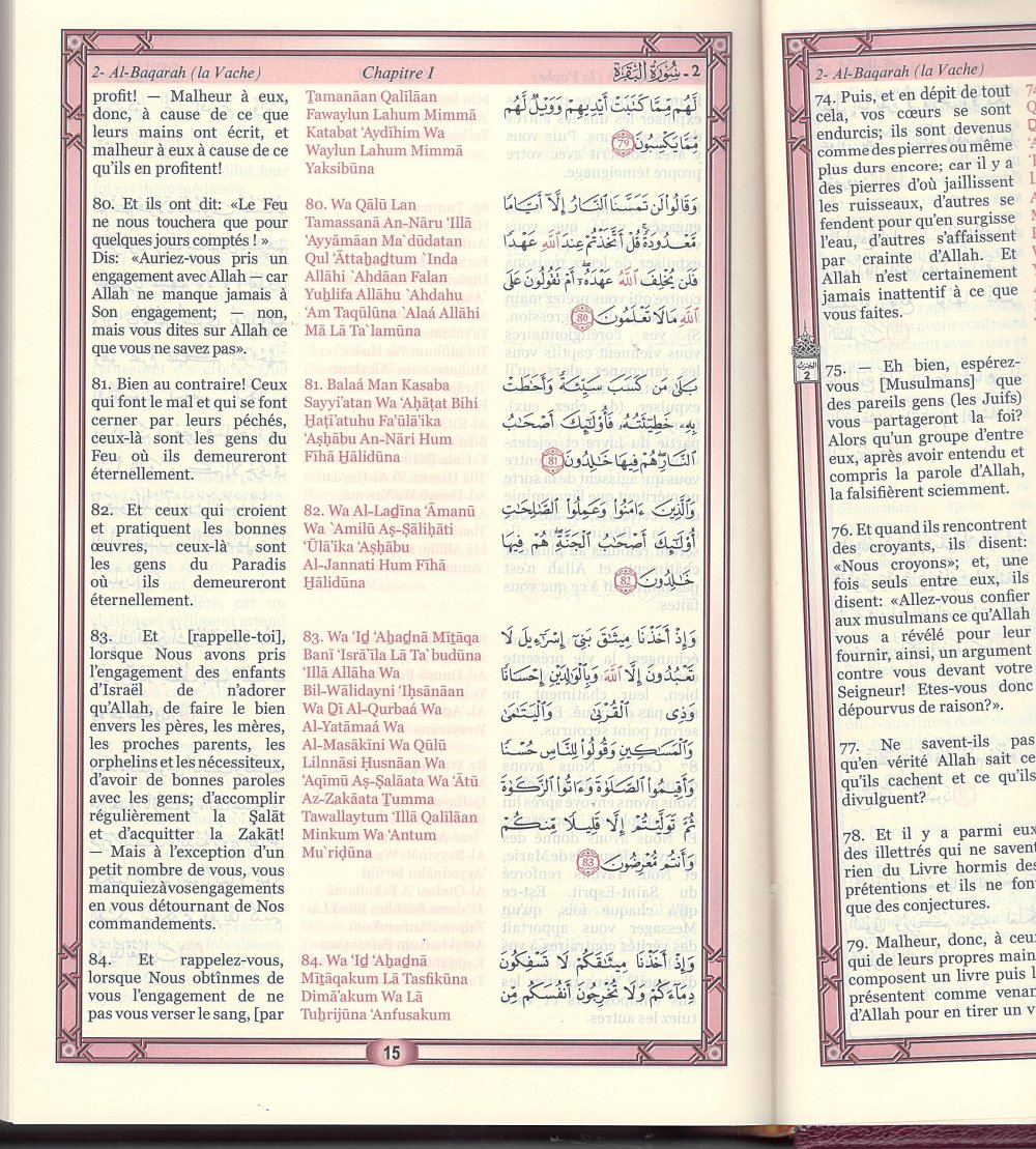 Coran arabe-français-phonétique avec présentation en 3 colonnes.