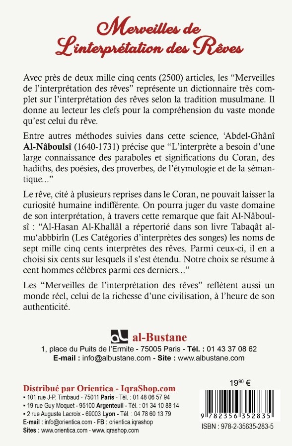 Avec près de deux mille cinq cents (2500) articles, les “Merveilles de l’interprétation des rêves” représente un dictionnaire très complet sur l’interprétation des rêves selon la tradition musulmane. Il donne au lecteur les clefs pour la compréhension du vaste monde qu’est celui du rêve.