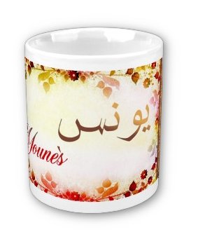 Mug avec le prénom "Younès" calligraphié en arabe (يونس) ainsi que son épellation lettre par lettre en arabe.