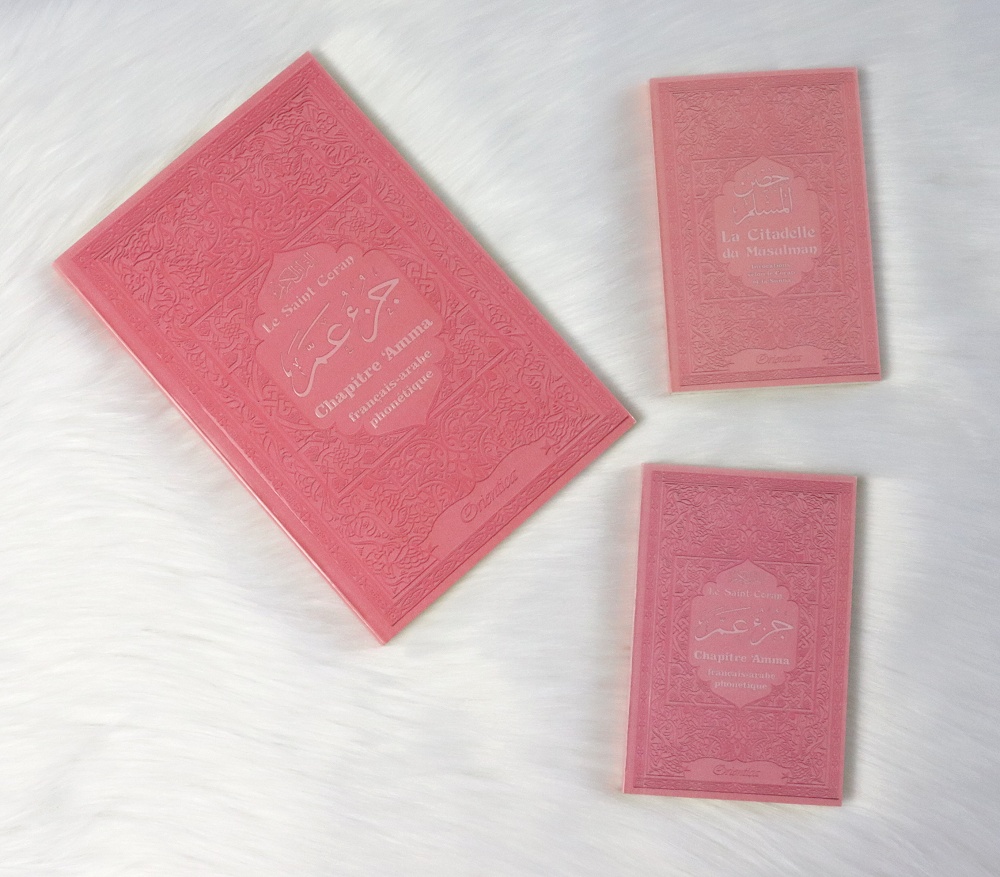 Pack cadeau constitué des trois livres de couleur rose claire assortie : La Citadelle du Musulman de poche et Le Saint Coran Chapitre Amma en deux tailles différente : format de poche et grande taille.