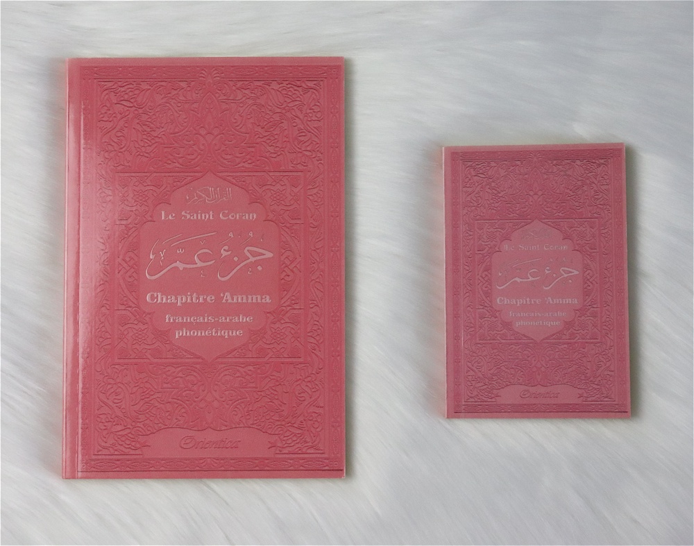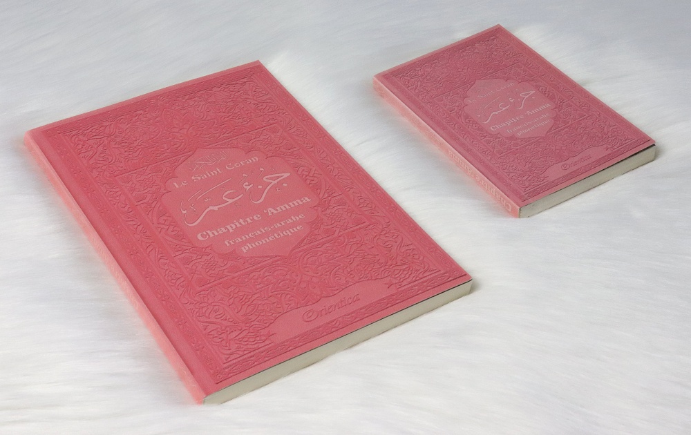 Pack cadeau constitué des deux livres Chapitre Amma en deux tailles différente : format de poche et grande taille. Contient deux hizb ('Ammâ et Sabbih) en français-arabe-phonétique. Couverture rose claire.