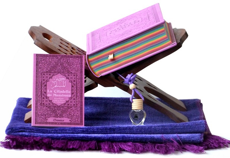 Pack cadeau mauve : Le Noble Coran (bilingue français/arabe) + La Citadelle du Musulman + Porte Coran + Tapis de prière en velours + Parfum Musc d'Or Luxe (au choix) - REF. 23308 (39.90 €)