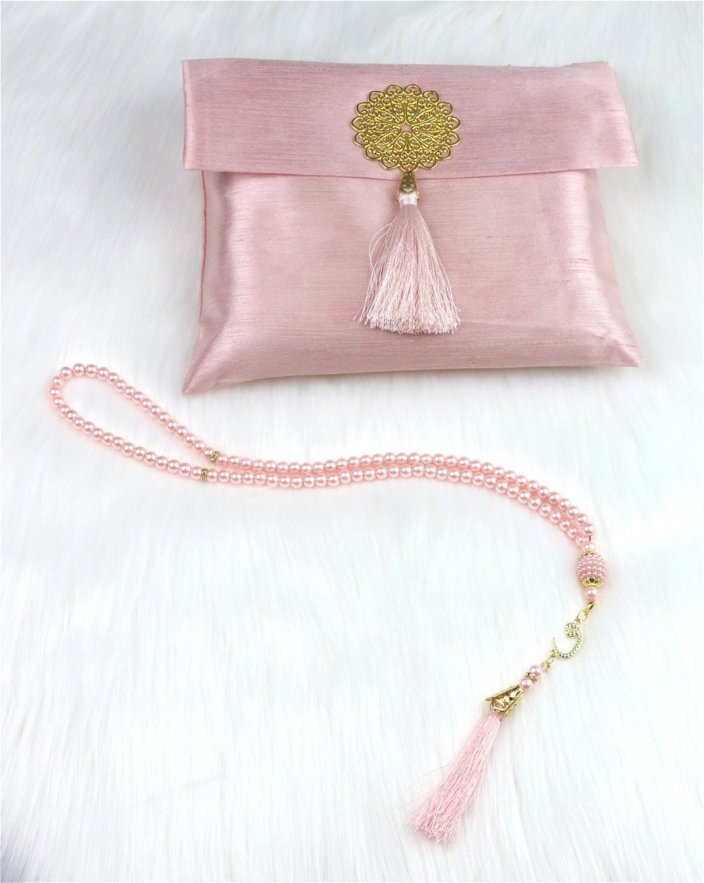 Sacoche cadeau : Pochette en tissu + Chapelet (Sebha) de luxe + Tapis de prière adulte - Couleur rose poudré Deco & Cadeau