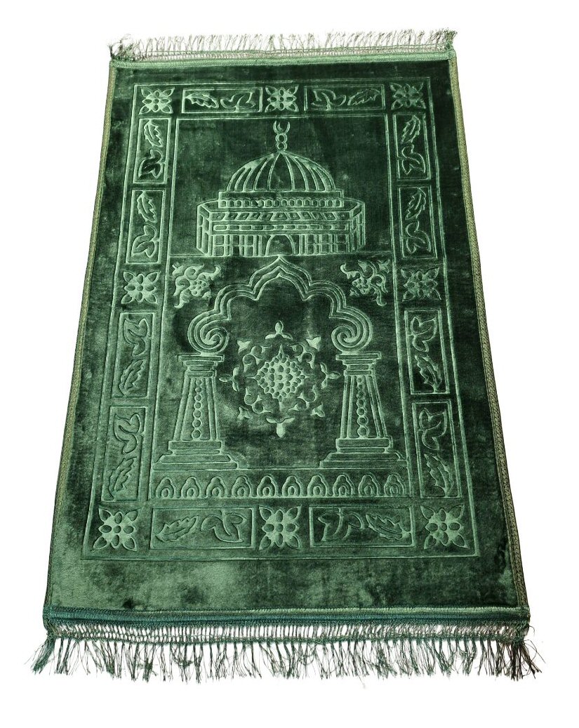 Grand tapis de prière luxe épais de couleur vert kaki avec motif kaaba discret - REF. 25179 (12.00 €)