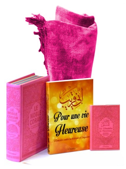 Coffret cadeau rose pour femme : Le Noble Coran avec couleurs Arc-en-ciel, La Citadelle du Musulman, Tapis en velours et Livre "Pour une vie Heureuse" - REF. 24098 (43.90 €) - En Promotion à 39.90 €