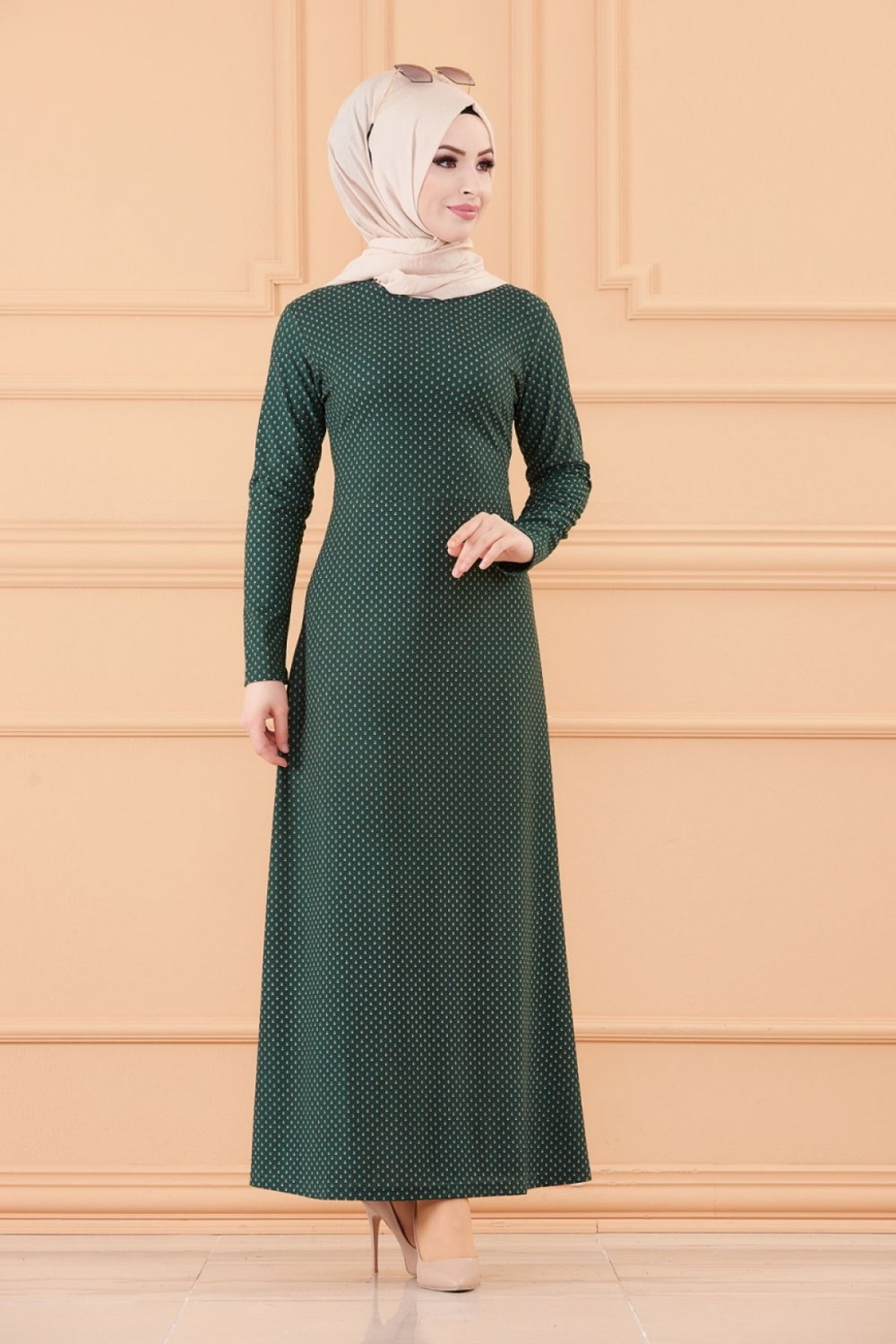Robe longue evasee pour femme motif pois (Vetement hidjab) - Couleur vert emeraude