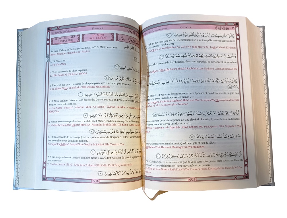 Le saint Coran avec versets en arabe, traduction française + transcription phonétique (translittération de l'arabe en caractères latins). Impression couleur, avec marque page intégré.
